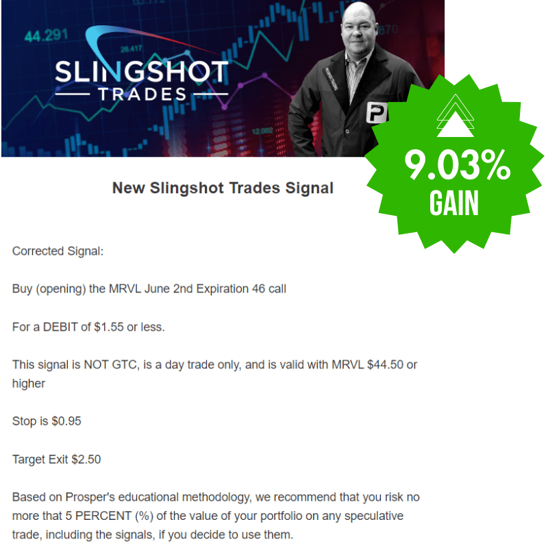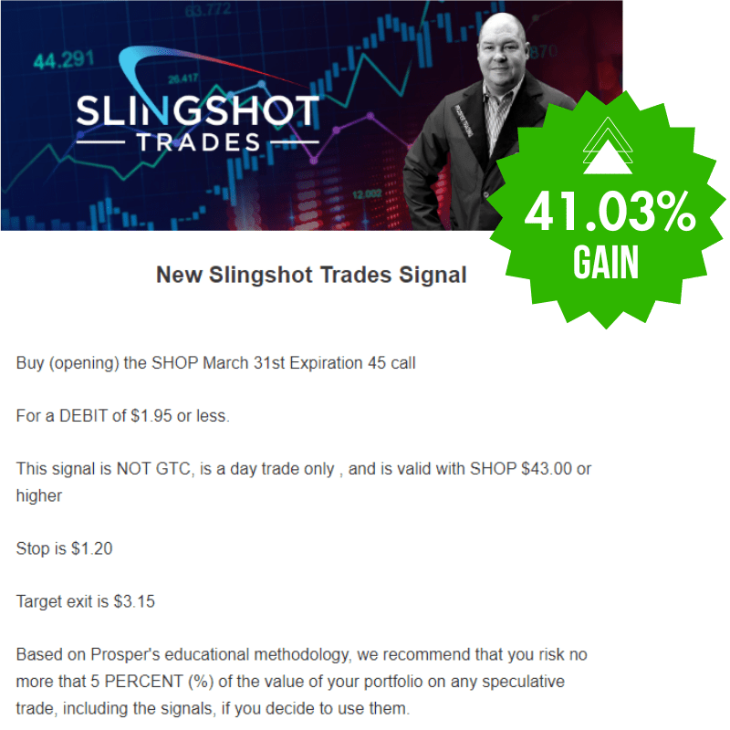 With the Slingshot Trades Program, you'll receive one high-potential, risk-minimized call or put option trade set-up every single week (3-5 per month), along with Mike's reasoning for potneitally entering the trade.